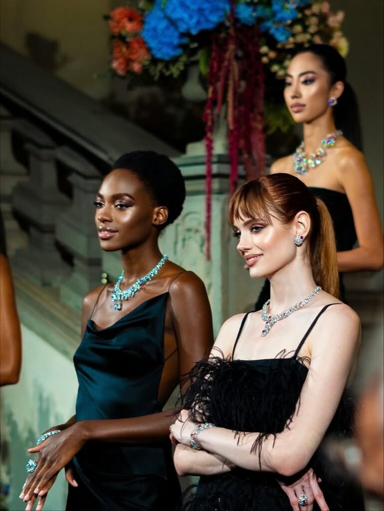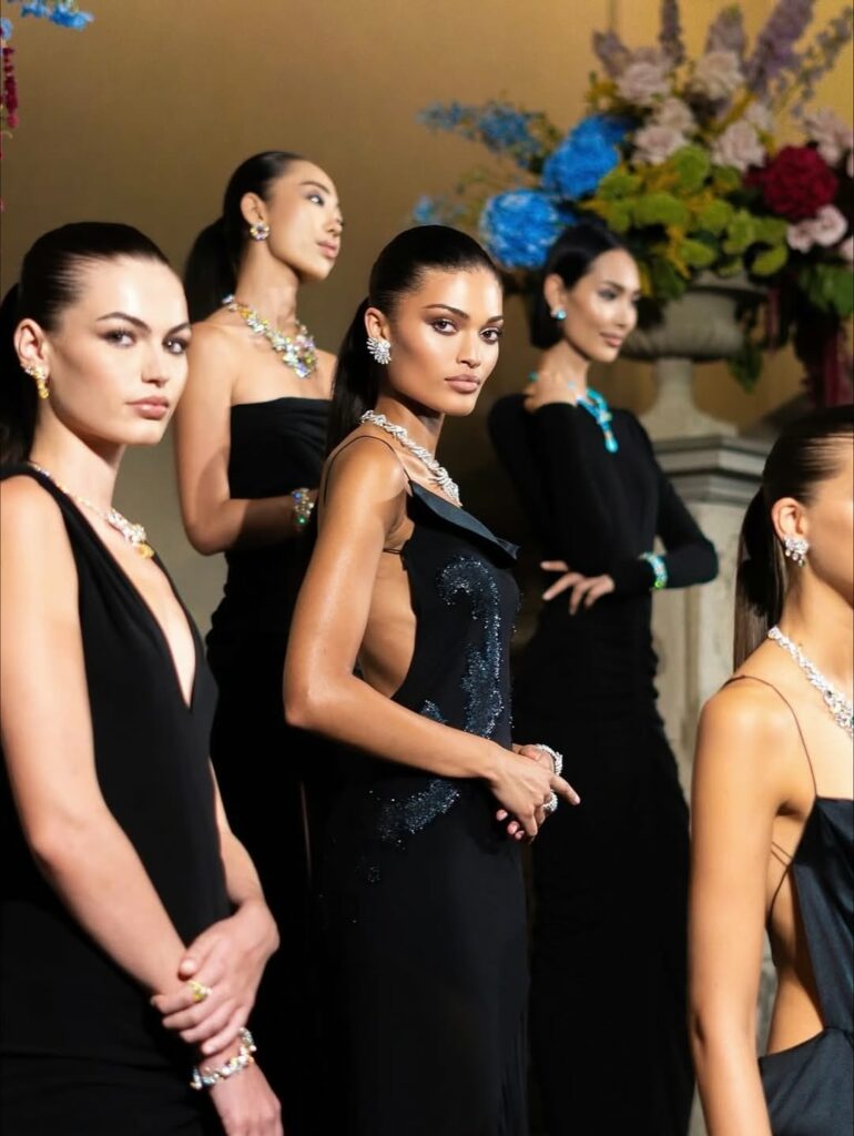 Inspired by the ocean’s fluid beauty, the looks reflected the collection’s marine themes—Anchor, Shell, Mermaid—through smooth textures, clean lines, and sculpted shapes. This minimalist yet polished styling enhanced the models’ features while perfectly complementing the sparkle of the jewelry and the elegance of their black evening gowns.
