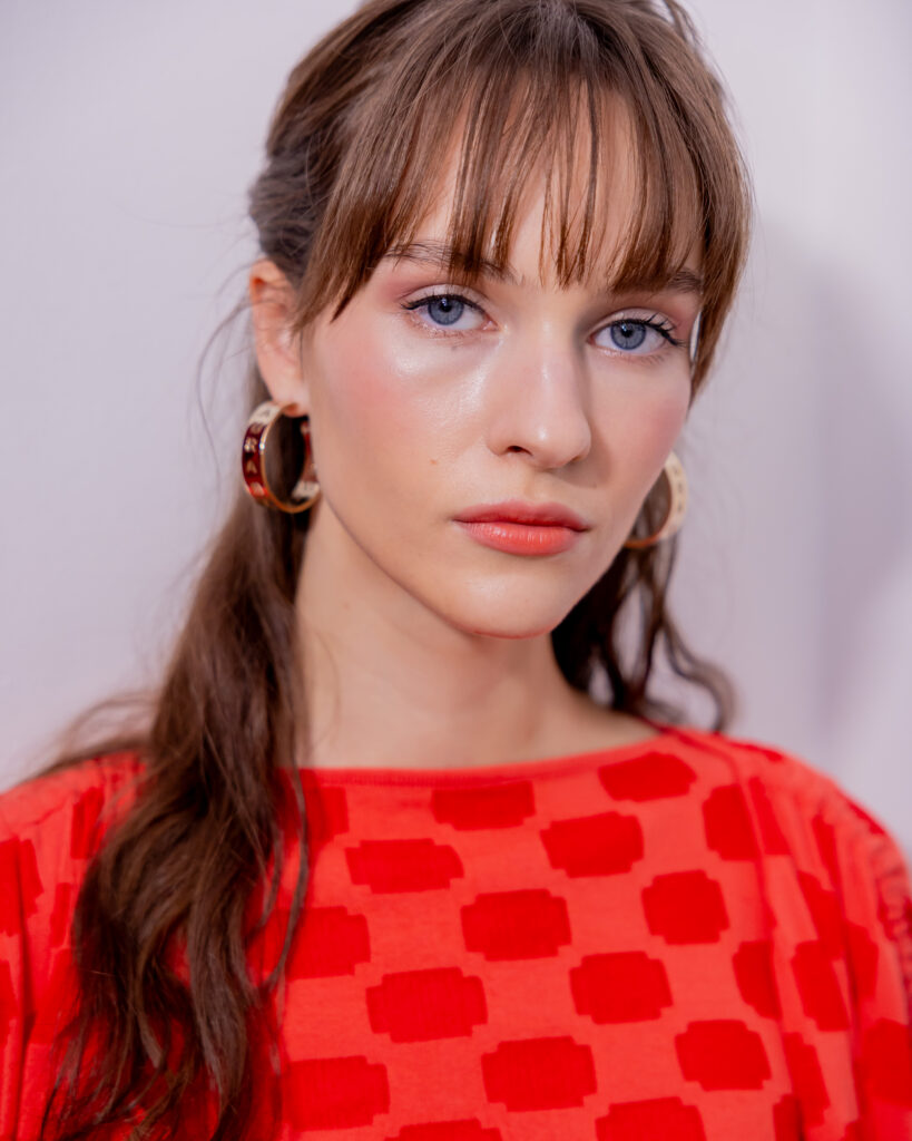 Il trucco firmato da Cristiana Ceccarelli esalta la luminosità del viso con tocchi freschi e brillanti. Lo sguardo si accende, le labbra in arancio caldo aggiungono carattere, mentre la pelle, leggera e trasparente, richiama la delicatezza di una farfalla in volo.